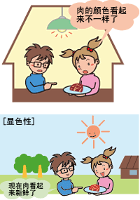 接下來,我們用這三個(gè)光源照明生肉,并觀察肉的顯色狀況。