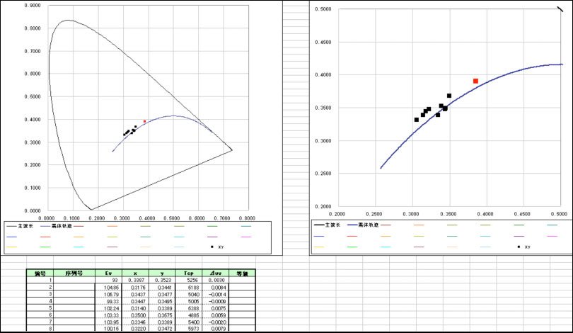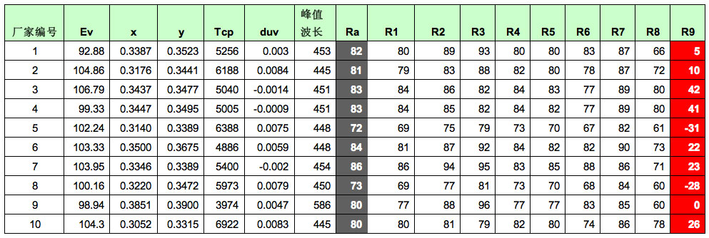 測量方法:選取10個不同廠家型號的白光LED燈管產品,燈管均由LED封裝陣列組成,正常燃點30分鐘后,在距離LED光管發光面正下方2米處用CL-500A測量產品的照明效果參數。