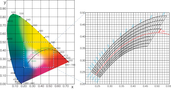 為此,對光源進行現場評價對建筑照明和戶外照明都顯得格外重要。在評估過程中,國家標準最關注的顯色指數和色溫無疑是現場測量的重要指標。為了使LED光源的色品質評估具體化,柯尼卡美能達與國家半導體光源質量監督檢測中心合作,以不同廠家生產的白光LED燈管進行現場的效果測試實驗,采用分光輻射照度計CL-500A實測了10種不同的LED燈管產品的照度、顯色指數、色溫、色坐標、峰值波長等基本參數,分別評估它們實際的照明效果。