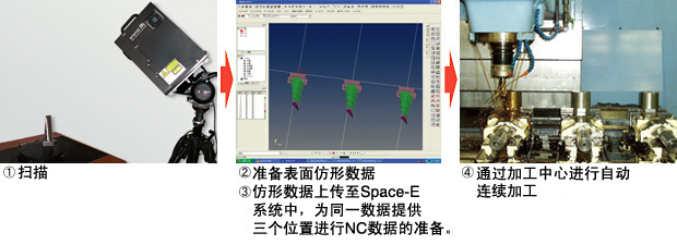 仿形機器必須一次只制造一件產(chǎn)品。 但是,引進VIVID 9i系統(tǒng)后,基于測量數(shù)據(jù),采用CAM軟件(Space-E:NTT數(shù)據(jù)處理系統(tǒng))準(zhǔn)備一個程序,以便可以通過同一樣板加工幾件產(chǎn)品, 這樣便實現(xiàn)了連續(xù)加工。 (請參見上述的操作流程。)
