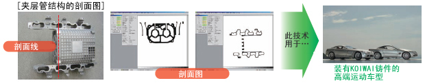 如下所示為傳統人工檢測與最新檢測過程的具體比較,還介紹了引入3D技術帶來的巨大變化。以形狀復雜的增壓器外殼為例,制造過程中采用了KOIWAI完善的技術來防止型芯偏移。