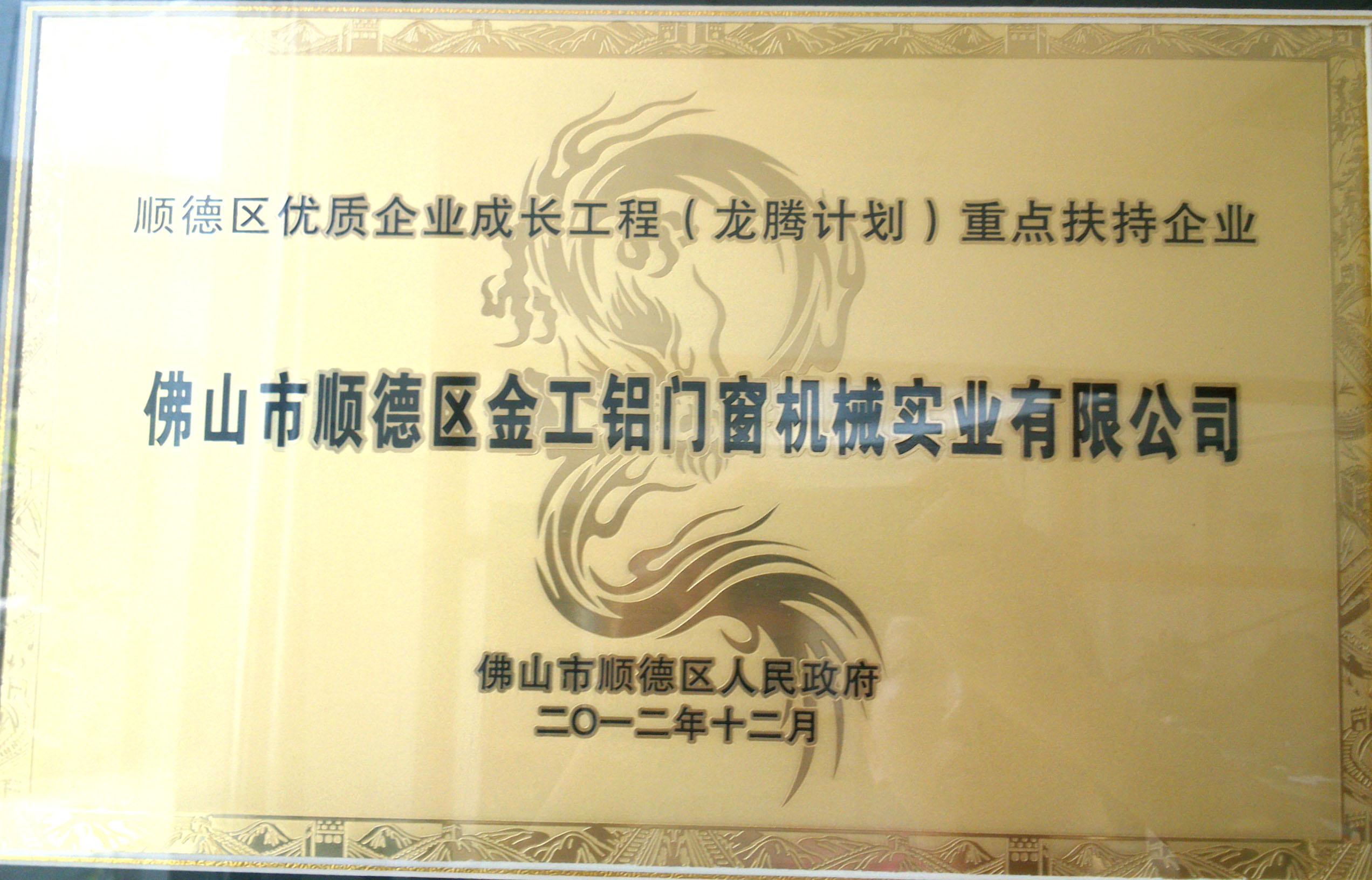 證書名稱: 順德區(qū)優(yōu)質(zhì)企業(yè)成長工程(龍騰計劃)重點(diǎn)扶持企業(yè)