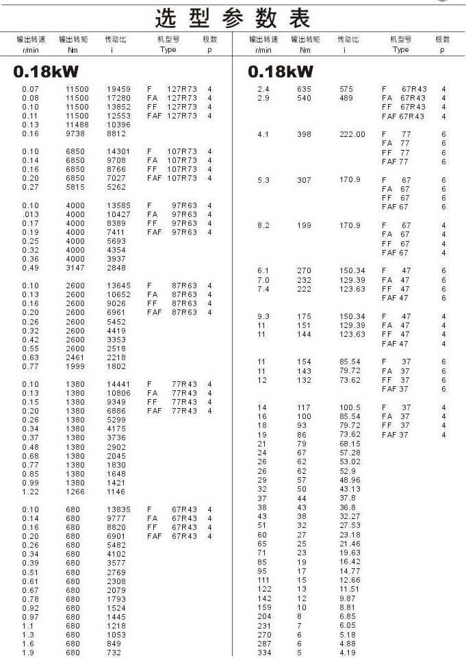 選型參數表0.18kW