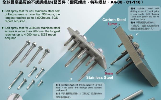 2、我司生產的410材質#12鉆尾可以鉆6MM厚的鋼板,并且可以連續鉆3次,同時可以鉆304不銹鋼的鋼板5MM,#14可以鉆8MM厚板,技術遠超國內同行業水平。