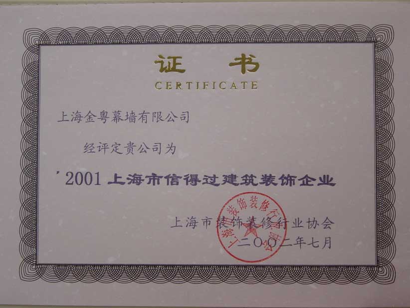 證書名稱: 2001上海市信得過建筑裝飾企業(yè)