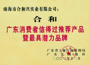 證書名稱: 廣東消費者信得過推薦品牌暨最具潛力品牌