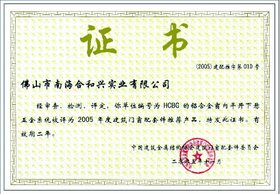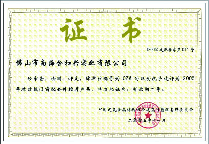 證書名稱: 2005年度建筑門窗建筑門窗配套件推薦產品