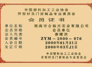 證書名稱: 異型材及門窗制品專業委員會會員證書