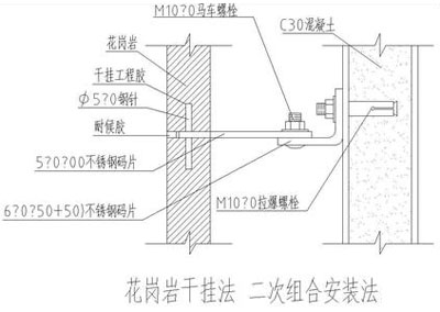 一.是插銷式固定法,主要構(gòu)件有銷釘、托板、螺栓、墊板和角鋼,各構(gòu)件的型號(hào)視石材自重、地區(qū)風(fēng)載和地震載荷計(jì)算確定,其結(jié)構(gòu)是:先將角鋼用螺栓固定于骨架或墻體上,并將托板與角鋼固定,石材通過(guò)銷釘與托板連接。該掛件可使板材在小范圍內(nèi)作上下前后調(diào)節(jié),以確保板縫的均勻與板面的平整。