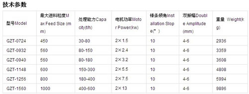 GZT系列振動給料機新型振動電機驅動,該系列振動給料機用于粗破碎機前的均勻給料,同時由于棒條篩面的作用,又能除掉泥土等細小物料,達到預先篩分的功能,能夠提高粗碎能力,該系列振動給料機新型振動電機或激振器激振,框架式環槽鉚釘鉚接,錳鋼制造的護板和棒條,結構堅固,強度高,耐沖擊,耐磨損,使用維護方便。
