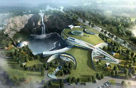 上海天馬山世茂深坑酒店是由上海世茂集團投資建設,是世界上首個建設于坑內的五星級酒店。酒店配備水下情景套房、空中花園、壯觀瀑布、鋼結構抗9級地震建筑等。2013年3月,深坑酒店正式動工。2013年1